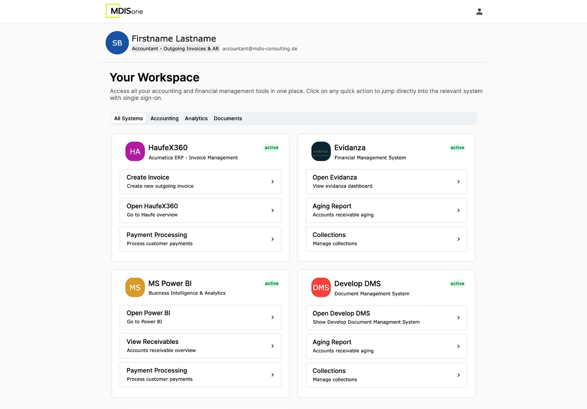 - Problem: Haufe X360, evidanza, BeSync & PowerBI, d.velop DMS – alle isoliert